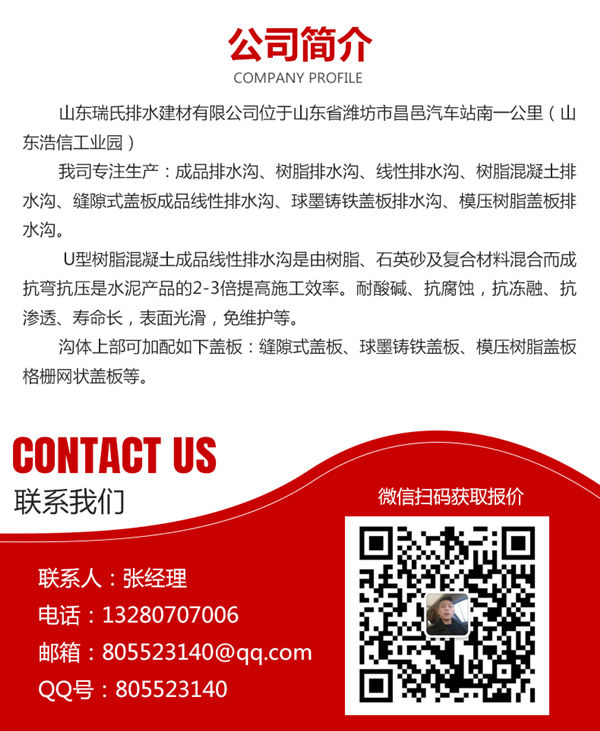 歡迎光臨山東瑞氏排水建材有限公司網(wǎng)站!主營:線性排水溝、樹脂排水溝、樹脂混凝土排水溝...熱線:132-8070-7006