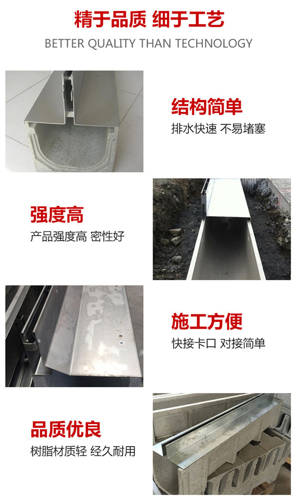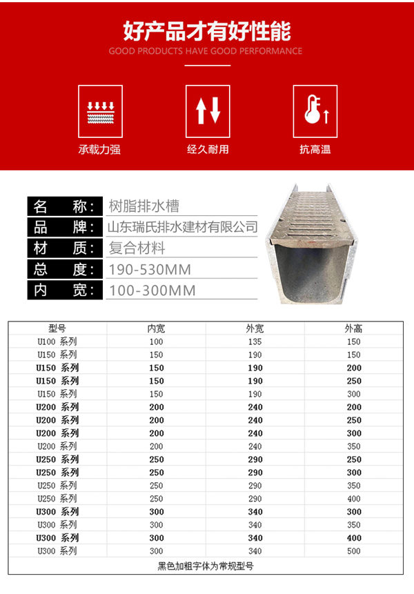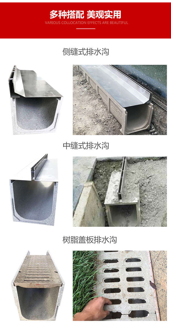 山東瑞氏排水建材有限公司專業(yè)生產(chǎn):樹脂混凝土排水溝成品排水溝線性排水溝樹脂排水溝、縫隙 式蓋板成品線性排水溝、球墨鑄鐵蓋板排水溝、模壓樹脂蓋板排水溝。 U型樹脂混凝土成品線性排水溝是由樹脂、石英砂及 復合材料混合而成,抗彎抗壓是水泥產(chǎn)品的2-3倍,提高 施工效率。耐酸堿、抗腐蝕,,抗凍融、抗?jié)B透、壽命 長,表面光滑,免維護等。 成品排水溝體上部可加配如下蓋板:縫隙式蓋板、球墨鑄鐵 蓋板、模壓樹脂蓋板、格柵網(wǎng)狀蓋板